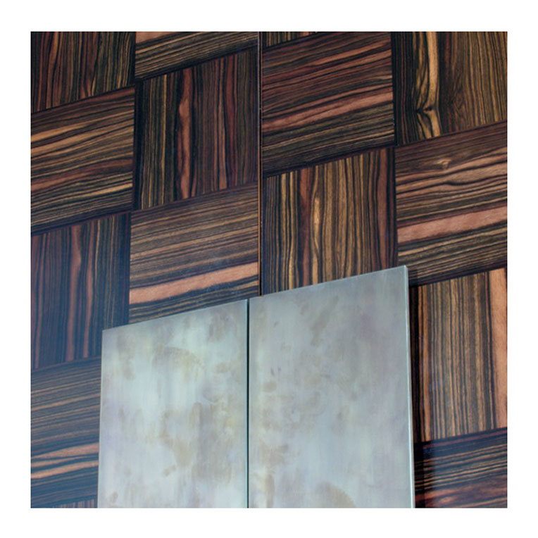 Originally designed as a bar unit, this cabinet can also be made to hold a TV. The doors feature a stunning patchwork of random veneer pieces.