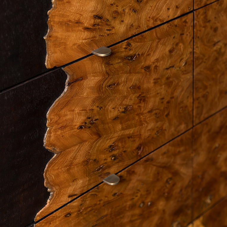 Made as an edition of two cabinets, which were crafted from Elm salvaged from the UK’s 1987 Great Storm. The power of the story inspired Anton to pay tribute to the life of the fallen tree and the completed cabinets are emblematic of his commitment to merging nature’s raw beauty with contemporary design principles. This contour of the natural edge contrasts vividly against the deliberately simple black background of Ebonised Red Gum. One cabinet features 12 drawers and the other has two doors.