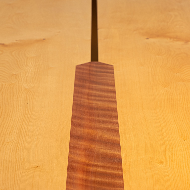 The Tasmanian Myrtle used as a highlight in the top and in the base provides a structured counterpoint to the fluidity of the tabletop. The table base is sleek and modern, grounding the table with a powerful sense of lightness. The contrast between the golden warmth